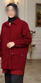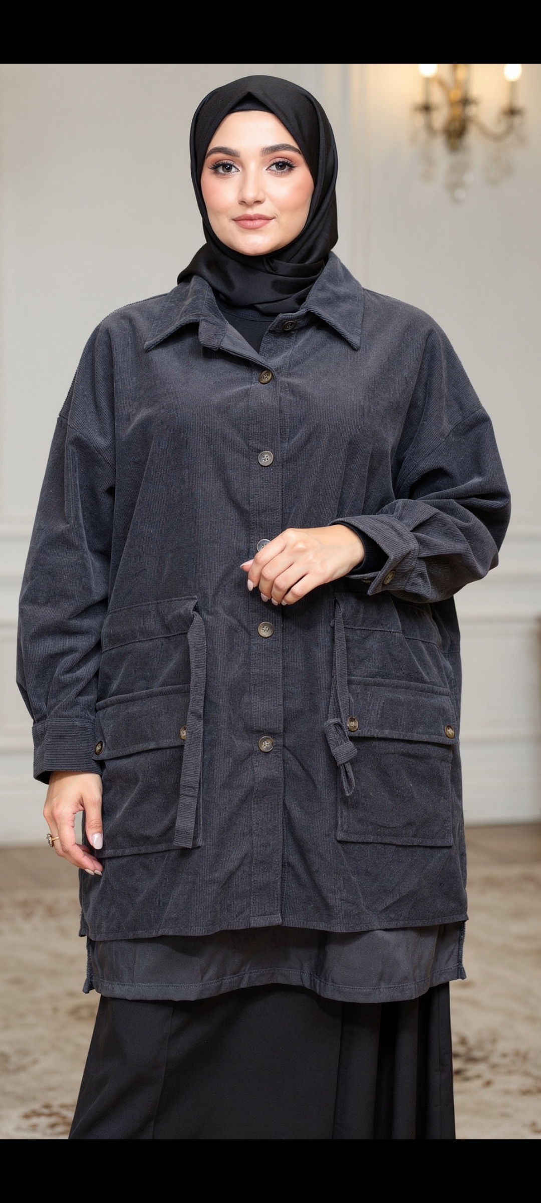 توجه داشته باشین که اون قسمت پایین مانتو از سمت جلوی کار کوتاهتر هست نسبت به پشت کار و مدل لباس برای حجاب زیر مانتویی پوشیده